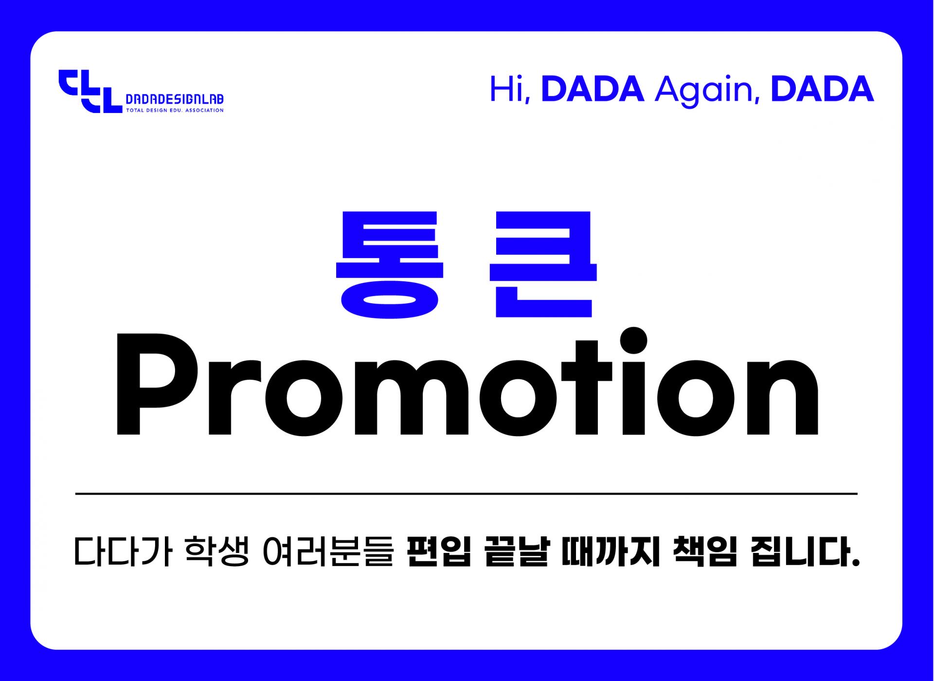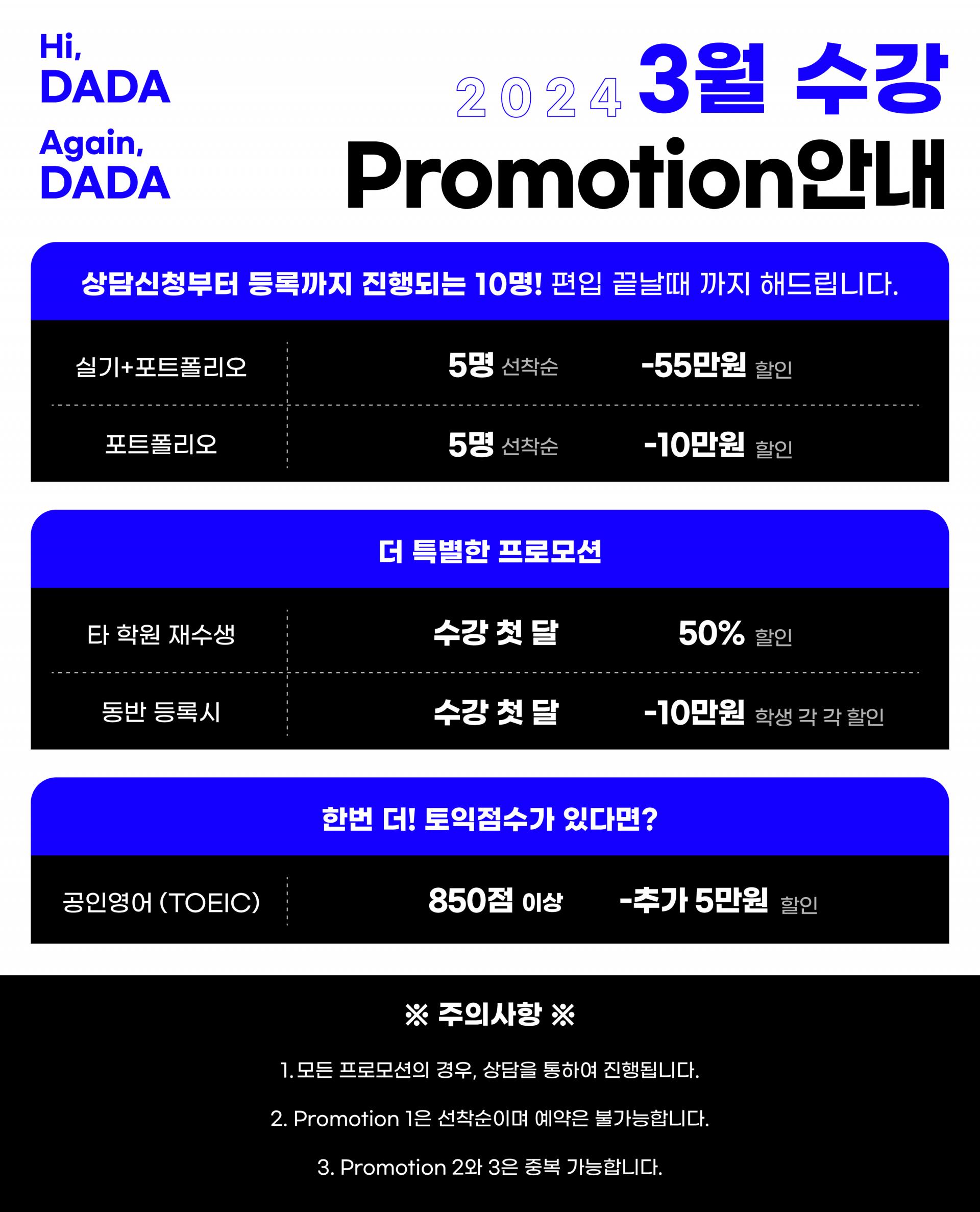 Promotion 1.편입 끝날 때까지 다다디자인랩이 책임지겠습니다.실기 + 포트폴리오 : 5명 -55만원 할인 (선착순)포트폴리오 5명 : -10만원 할인 (선착순)※위 프로모션은 선착순으로 진행되오니 조기마감 될 수 있는 점 참고 부탁드립니다.※Promotion 2.